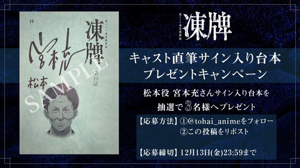 『凍牌~裏レート麻雀闘牌録~』 第10話「慧眼」放送を記念して、抽選で3名様に松本役 宮本充さん直筆サイン入り台本があたるキャンペーンを開催!
